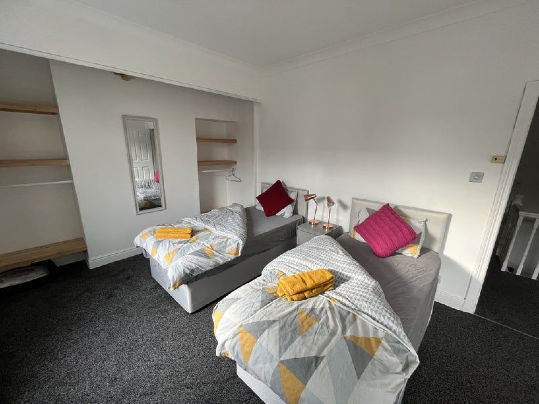 Upstairs are three bedrooms, two double and one single, these comprise one double and three single beds in total. The bedrooms come with wardrobes and drawers and bedside lamps. There are black out curtains too.