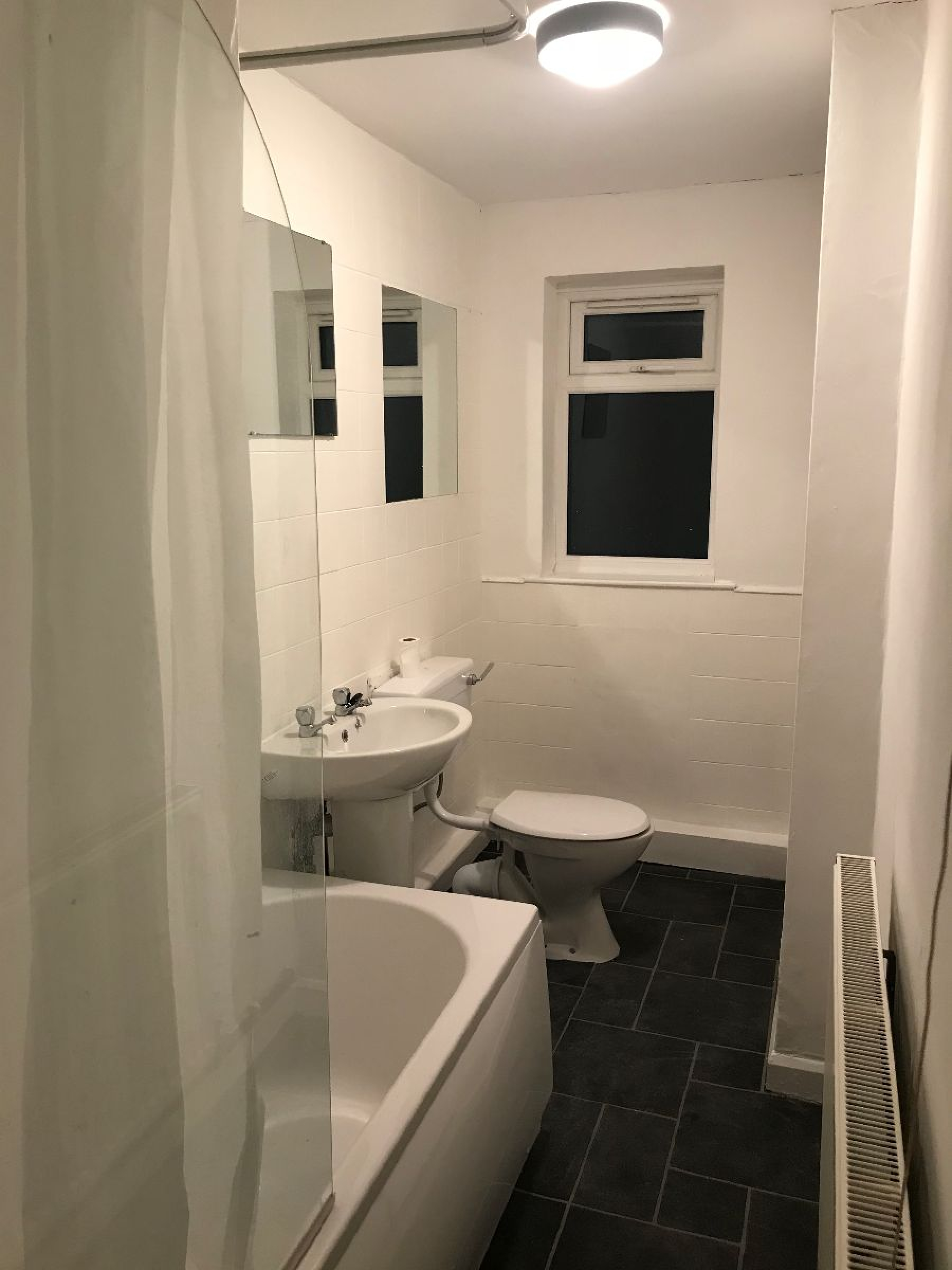 Downstairs bathroom features white suite and shower over bath to scrub up well.